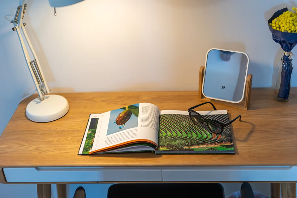 • Bedroom: Large double bed with a high-quality mattress and bedding. Desk and chair for working or reading, large mirror, and a spacious wardrobe with lighting.